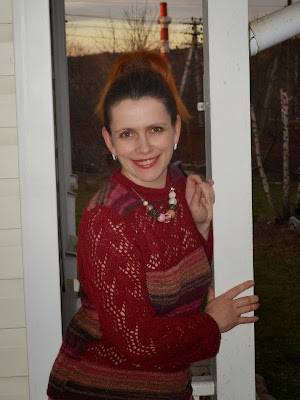 Преодолевая клацанье зубов (это я еще не знала, что проторчу больше часа меняя колеса и моя машину в автосервисе), я выскочила на крыльцо, изобразила наподобие улыбки и сделала фото пуловера на себе. Про историю его создания я уже писала, дам ссылочку на еще один вариант такого пуловера, но автор явно испугался ажурного края рукава и там только полоса на рукавах связана. Зато цвет как в оригинале и полосы в том количестве как положено. Далее фото.